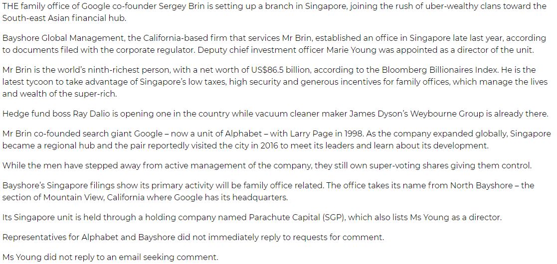 Sergey Brin, Google Co-Founder, set up branch in Singapore. Owing to Singapore low taxes, generous incentives and high security attributions.